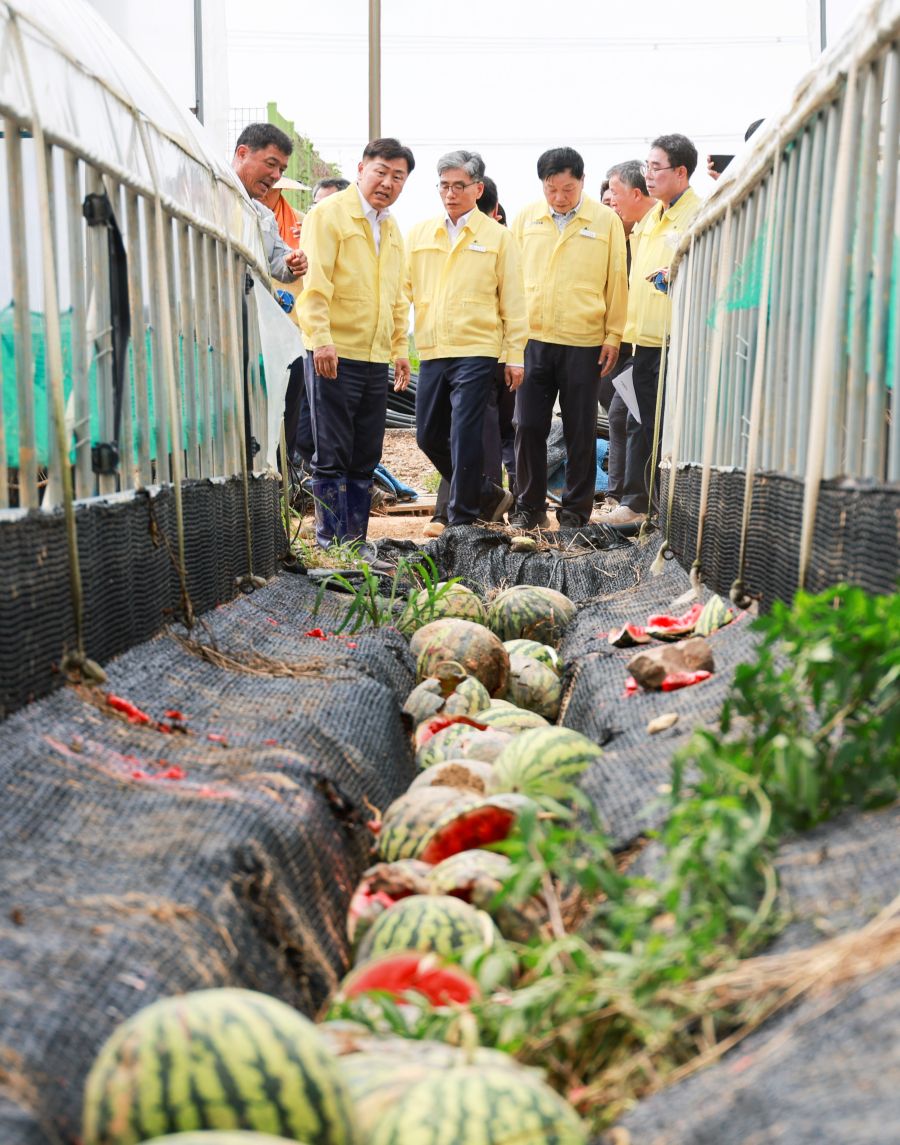 이번 현장 방문은 김관영 전북특별자치도지사를 비롯한 도 및 고창군 관계자들이 참석한 가운데 진행되었으며, 지방하천 범람으로 수박 하우스 8동(7,131㎡) 침수 피해가 발생한 현장을 찾아 자율방재단 및 경찰 인력 등 복구인력들의 활동상황을 점검하고, 피해농가와 직접 소통하며 애로사항을 청취하였다.